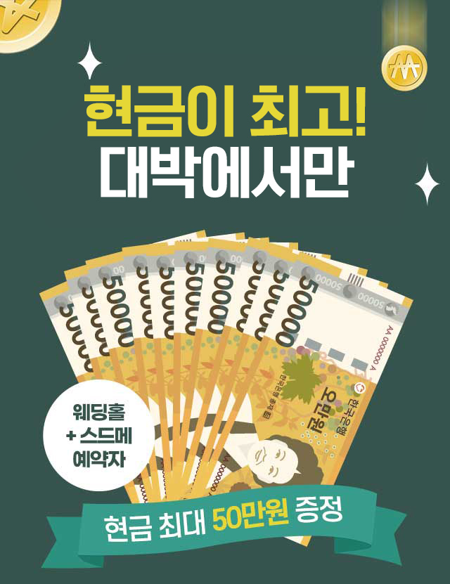 결혼준비하시는데 가장필요한건? 바로 현금이죠! 그래서 대박웨딩에서만 준비했습니다. 웨딩홀과 스드메예약자에 한해서 현금 최대 50만원 증정해드립니다. 다양한 경품도 받아보세요!